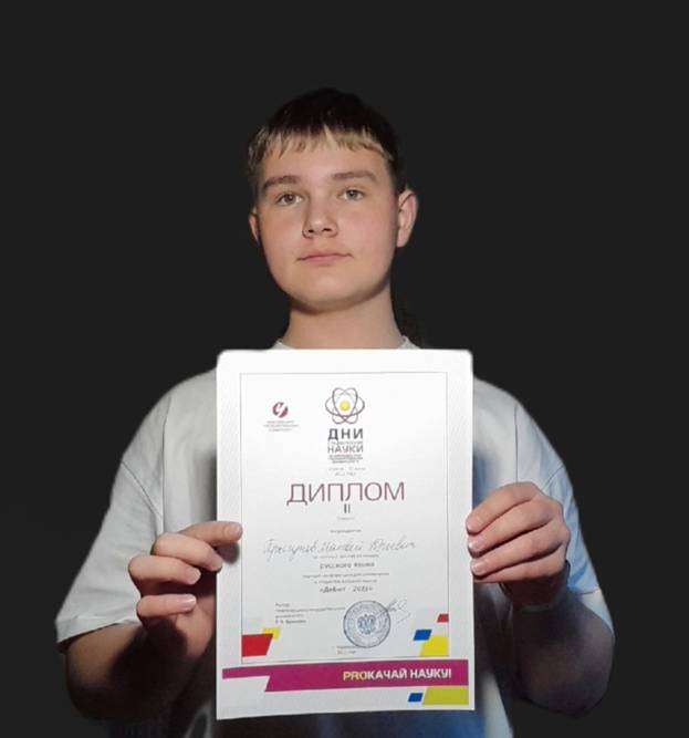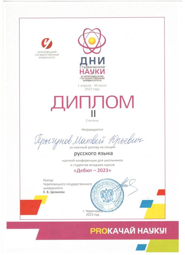 Студент Прыгунов Матвей (группа 101) получил диплом II степени за научный доклад на секции "Русский язык", подготовленный под руководством преподавателя А.Н. Соловьевой.