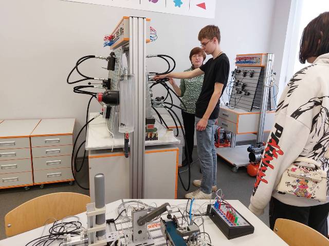 На стендах по мехатронике школьники работали под руководством наставника Н.Е. Базиновой.