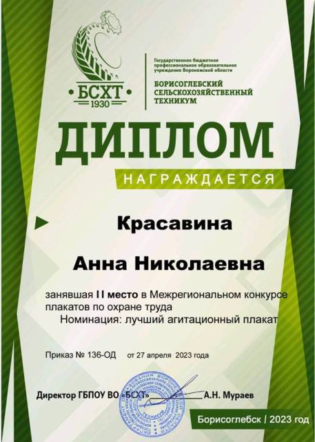 Поздравляем студентку 261 группы Красавину Анну, занявшую 2 место в Межрегиональном конкурсе плакатов по охране труда в номинации "Лучший агитационный плакат".