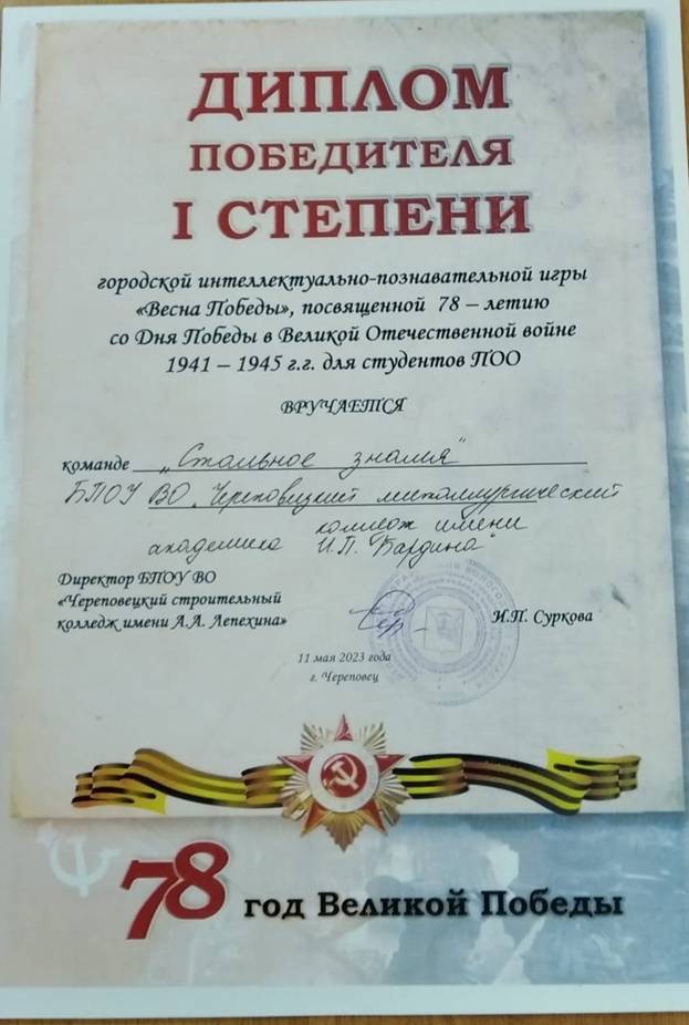 В соответствии с планом совместных мероприятий ПОО г. Череповца 11 мая 2023 года на базе БПОУ ВО «Череповецкий строительный колледж имени А.А. Лепехина» состоялась городская интеллектуально-познавательная игра «Весна Победы», посвященная 78-летию со Дня Победы в Великой Отечественной войне.