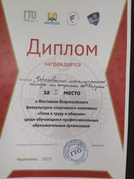 Мероприятие проходило с 17 по 19 мая 2023 года на спортивных объектах Спортивного клуба Череповец среди студентов профессиональных образовательных организаций. Программа фестиваля состояла из дисциплин комплекса «ГТО»: силовая подготовка, лёгкая атлетика, плавание. В торжественной обстановке медали, грамоты и призы ребятам вручили директор спортивного клуба Череповец Сергей Николаевич Назаров и начальник Центра тестирования ГТО Вадим Романович Ершов. Команда Череповецкого металлургического колледжа имени академика И.П. Бардина заняла 1 место в составе: