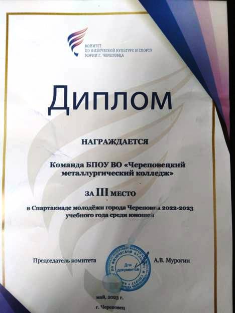 30 мая 2023 года в МАУ «Спортивный клуб Череповец» прошло награждение годовой Спартакиады молодёжи города. Спартакиада молодежи города Череповца 2022-2023 учебного года (далее - Спартакиада) проходила в соответствии с календарным планом физкультурных мероприятий и спортивных мероприятий города на 2023 год, утвержденным постановлением мэрии г. Череповца № 6260 от 25.12.2019 г.