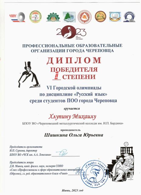 2 место: Хлупин Михаил (группа 171), руководитель - О.Ю. Шишкина;