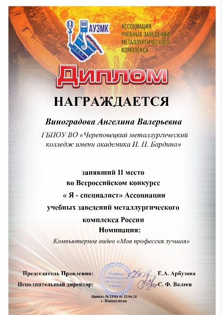 2 место в номинации Компьютерное видео «Моя профессия лучшая» жюри конкурса присудило работе студентов группы 4ОМД-1 Арсеньева Дениса, Киселевой Анастасии, Виноградовой Ангелины, Галкова Дениса и Балычиной Виктории, руководитель преподаватель Кузнецова Н.В.