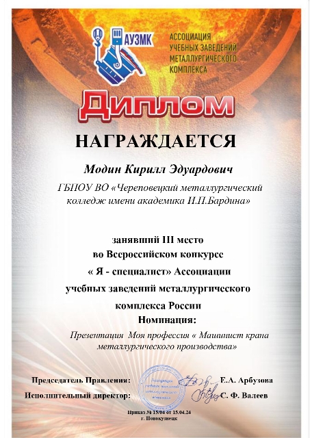 3 место в номинации Презентация «Моя профессия «Машинист крана металлургического производства» получил проект студента группы 261 Модина Кирилла под руководством преподавателя Ермиловой С.В.