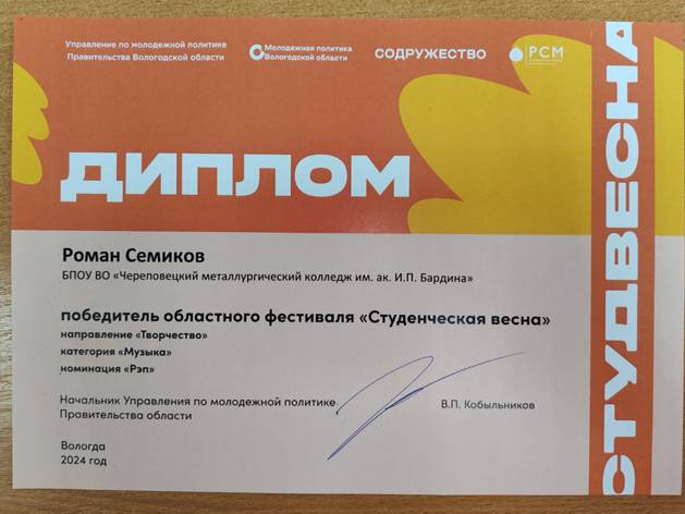 Среди победителей - в категории «Музыка», номинации «Рэп» - Роман Семиков, студент 4 курса специальности Монтаж, техническое обслуживание и ремонт промышленного оборудования!