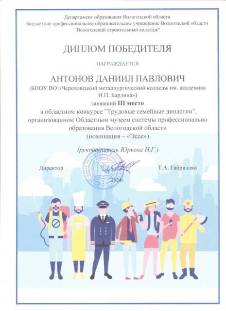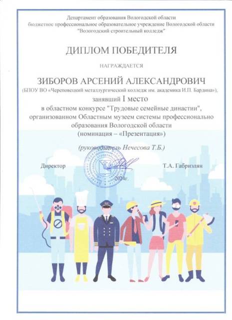 В связи с этим, областной музей системы профессионального образования Вологодской области проводил областной конкурс творческих работ «Трудовые семейные династии», в котором приняли участие студенты и педагоги БПОУ ВО «Вологодский строительный колледж», БПОУ ВО «Череповецкий металлургический колледж им. академика И.П. Бардина», БПОУ ВО «Череповецкий лесомеханический техникум им. В.П. Чкалова», БПОУ ВО «Вологодский колледж права и технологии», БПОУ ВО «Вытегорский политехнический техникум».