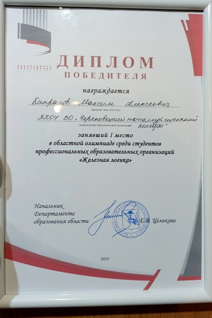 1 место Капралов Максим БПОУ ВО " Череповецкий металлургический колледж"