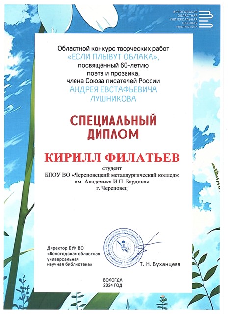 Студент 101 группы Череповецкого металлургического колледжа Филатьев Кирилл награжден специальным дипломом за стихотворение «Одинокая душа», представленное на Областной конкурс творческих работ «Если плывут облака».
