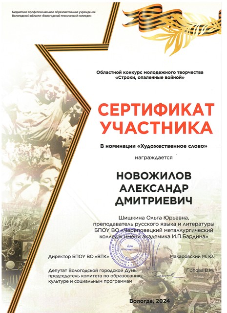 Студент 171 группы Череповецкого металлургического колледжа Новожилов Александр Дмитриевич принял участие в областном конкурсе молодежного творчества «Строки, опаленные войной». Преподаватель Шишкина Ольга Юрьевна.