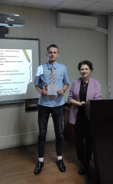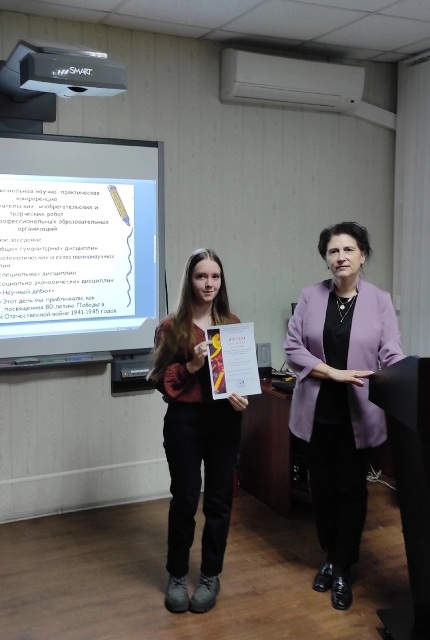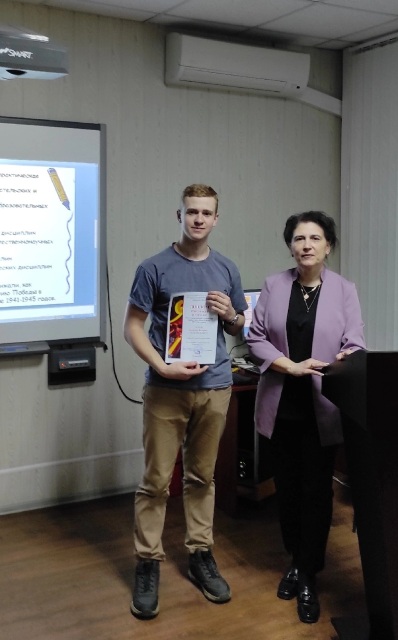 3 место - разделили работы по теме «Эволюция транспортной терминологии русского языка», автор: Тицкая Илона, студентка гр.1 ОП1 (руководитель - Туманова Ирина Владимировна) и по теме «У войны не женское лицо, у войны не женское начало», авторы: Карклиневский Егор, Матухин Богдан, студенты гр.1 ТО1 (руководитель – Антоненко Анна Викторовна).