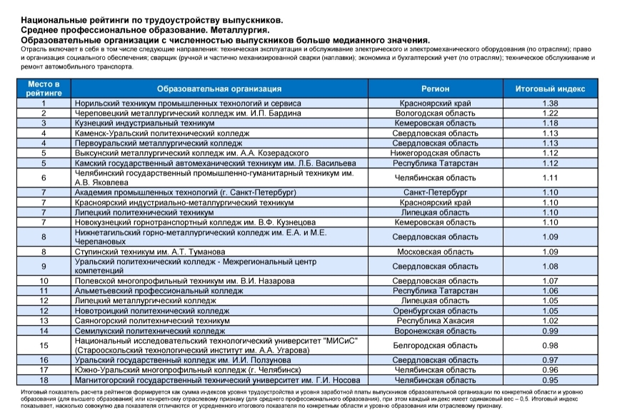 По направлению "Металлургия" наш колледж стал вторым среди всех колледжей страны!