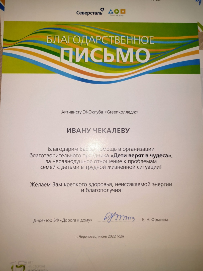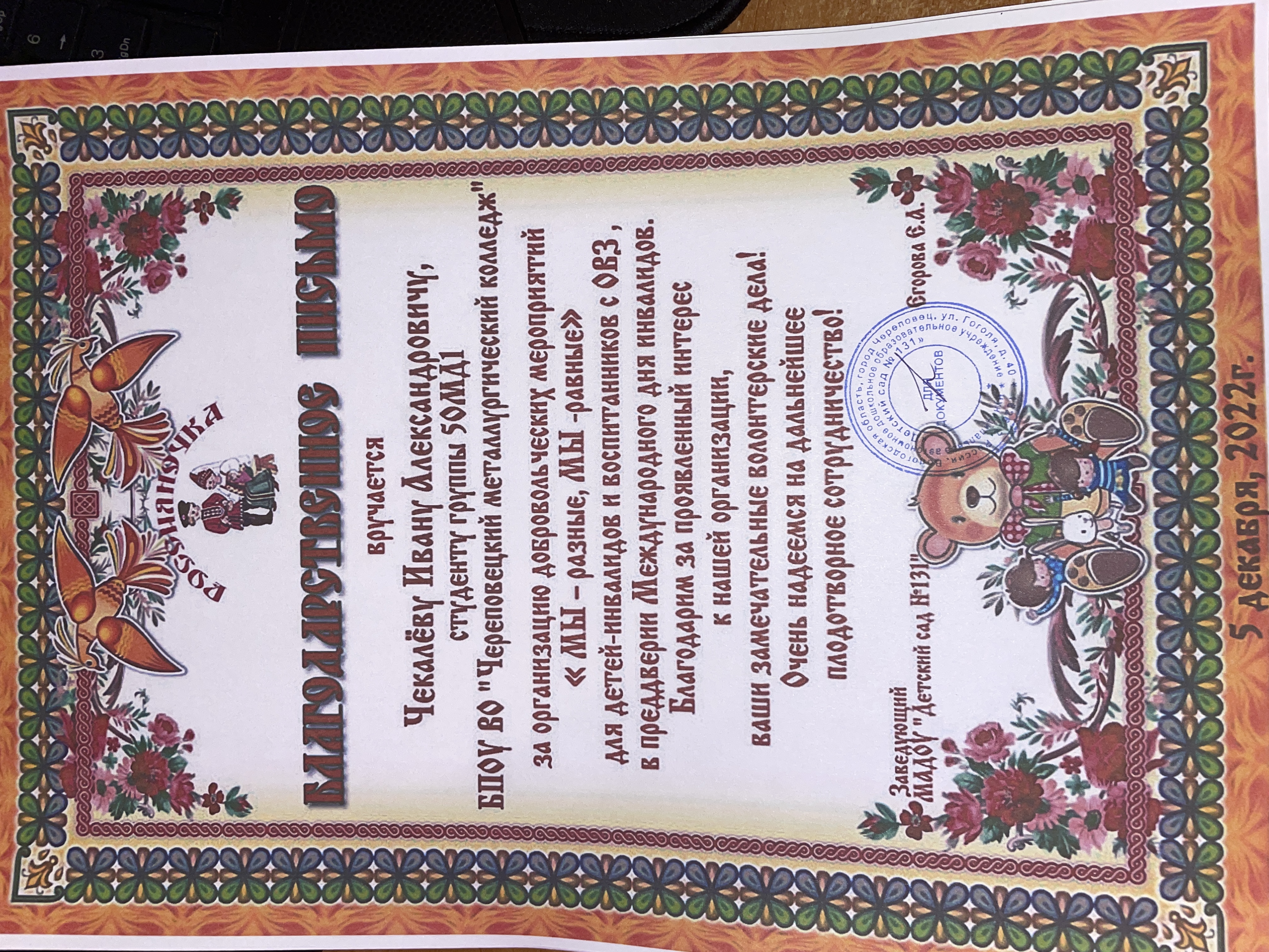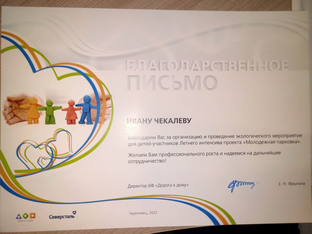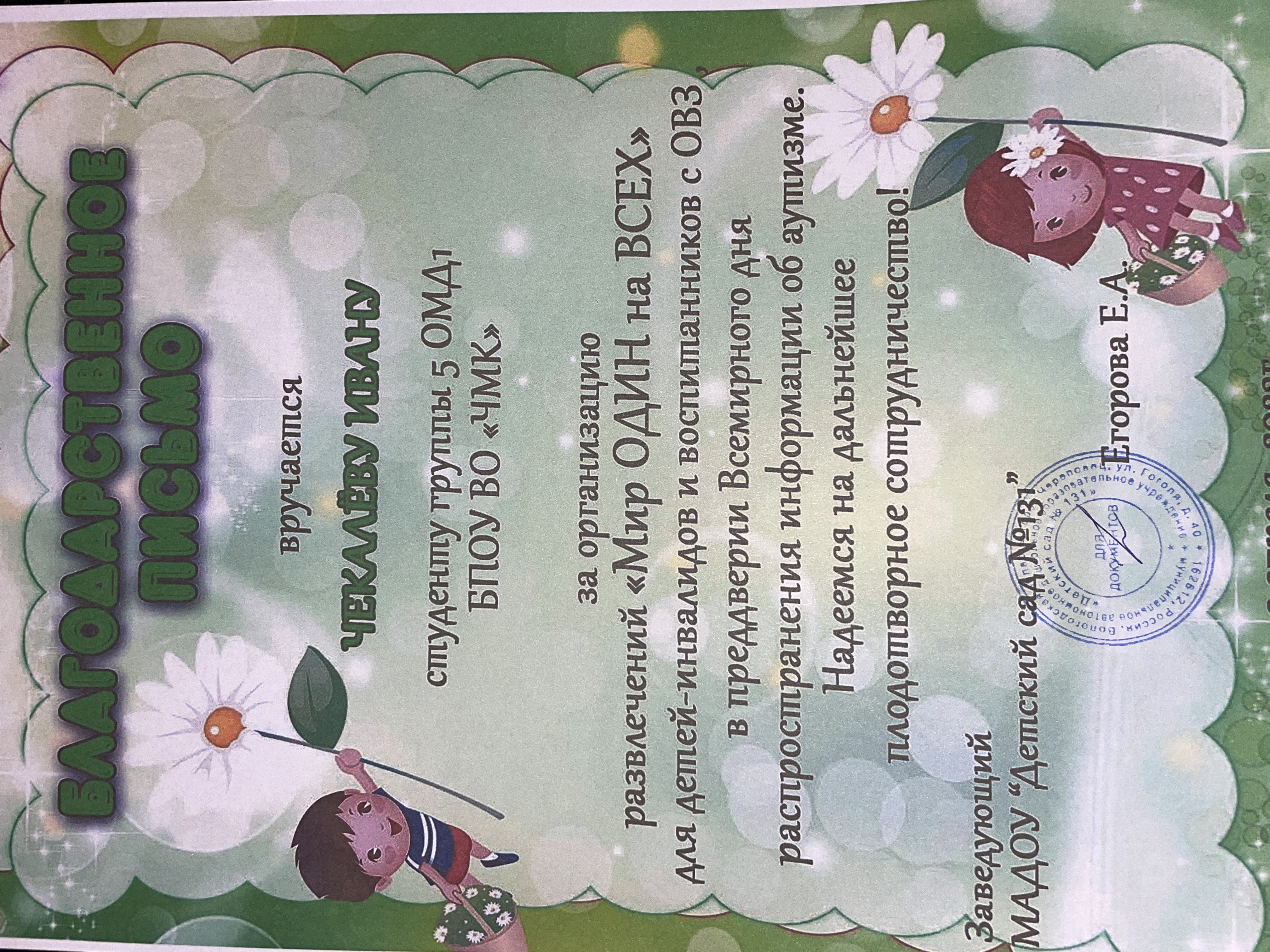 Благодарственное письмо Чекалеву И. Мы - разные, мы - равные